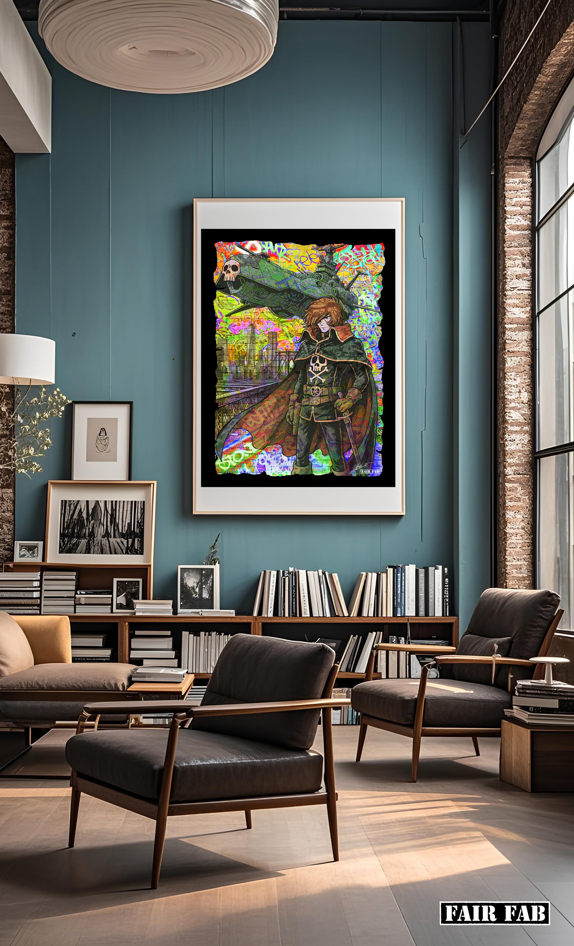 The central figure is unmistakably inspired by Captain Harlock, the legendary space pirate from Leiji Matsumoto’s classic manga and anime. He stands defiantly, sword in hand, cloaked in a flowing cape emblazoned with a skull and crossbones – a symbol of rebellion and defiance. Behind him looms the Arcadia, his iconic spaceship, painted in murky greens and grays, adorned with its own massive skull insignia, appearing almost ghostly and supernatural.