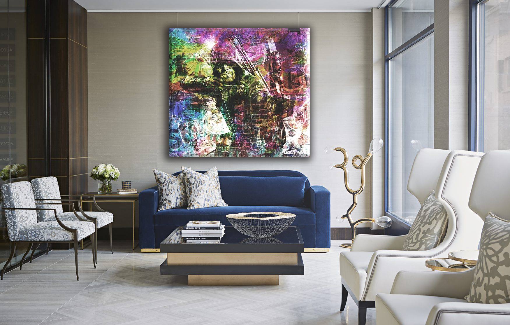 Behind him, dynamic tags and abstract forms provide a sense of motion, like the mural itself is vibrating with tension.
