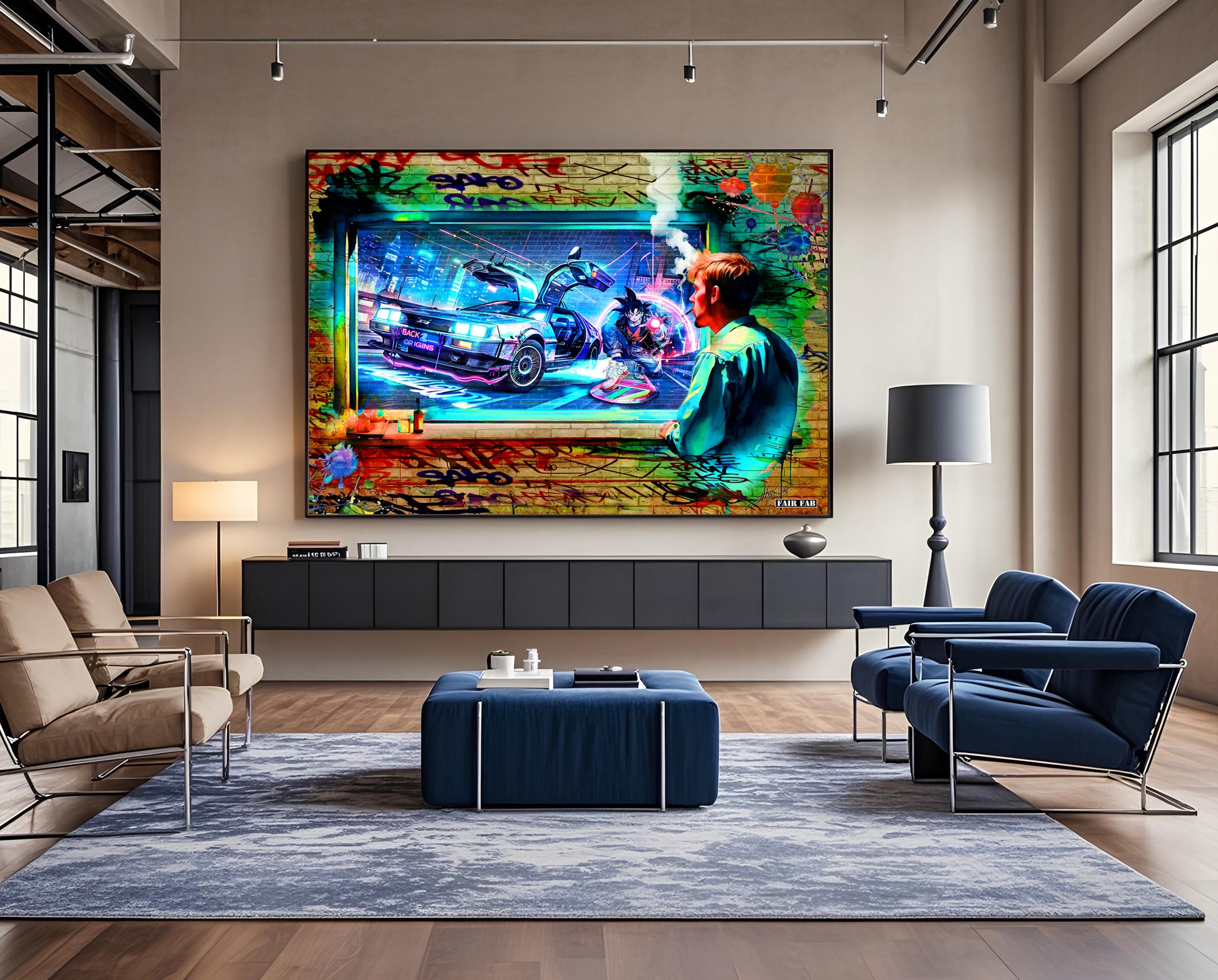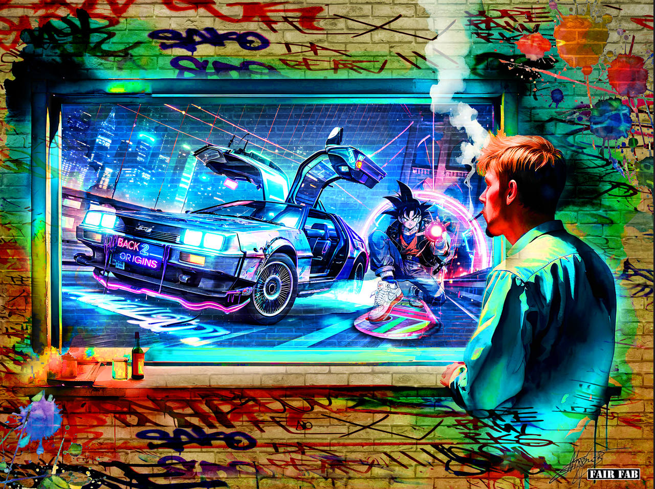Art Description: A vivid fusion of retro-futurism and pop culture mythology, Back to Origins pulls the viewer through time and memory with electrifying force. At the heart of the image is the iconic DeLorean from Back to the Future, mid-flight, headlights blazing, its gullwing doors open as if inviting the viewer into an epic crossover of eras and dimensions. Inside this neon-drenched portal, Goku from Dragon Ball Z—dressed in contemporary streetwear—launches a fierce Kamehameha while riding a hoverboard reminiscent of Marty McFly’s. The synergy of motion, power, and attitude channels both nostalgia and rebellion, celebrating a generation raised on animated heroes and cinematic legends. Framing this fantastical scene is the silhouette of a young man, painted in luminous brushstrokes, exhaling a plume of vapor as he gazes through the window-like opening in a graffiti-covered wall. His contemplative stance suggests he's both an observer and a dreamer—perhaps even a time traveler himself, caught between past influences and present realities. The graffiti, splatters, and tags surrounding the frame evoke urban street culture, reminiscent of works by Kobra, D*Face, and Eduardo Kobra, while the vibrant colors and surreal composition echo the cyberpunk aesthetic of artists like James Jean and Beeple. Signed “FAIR FAB,” the piece is a cultural remix—an urban love letter to the legends of anime, film, and the timeless question: What if we could go back... to where it all began?