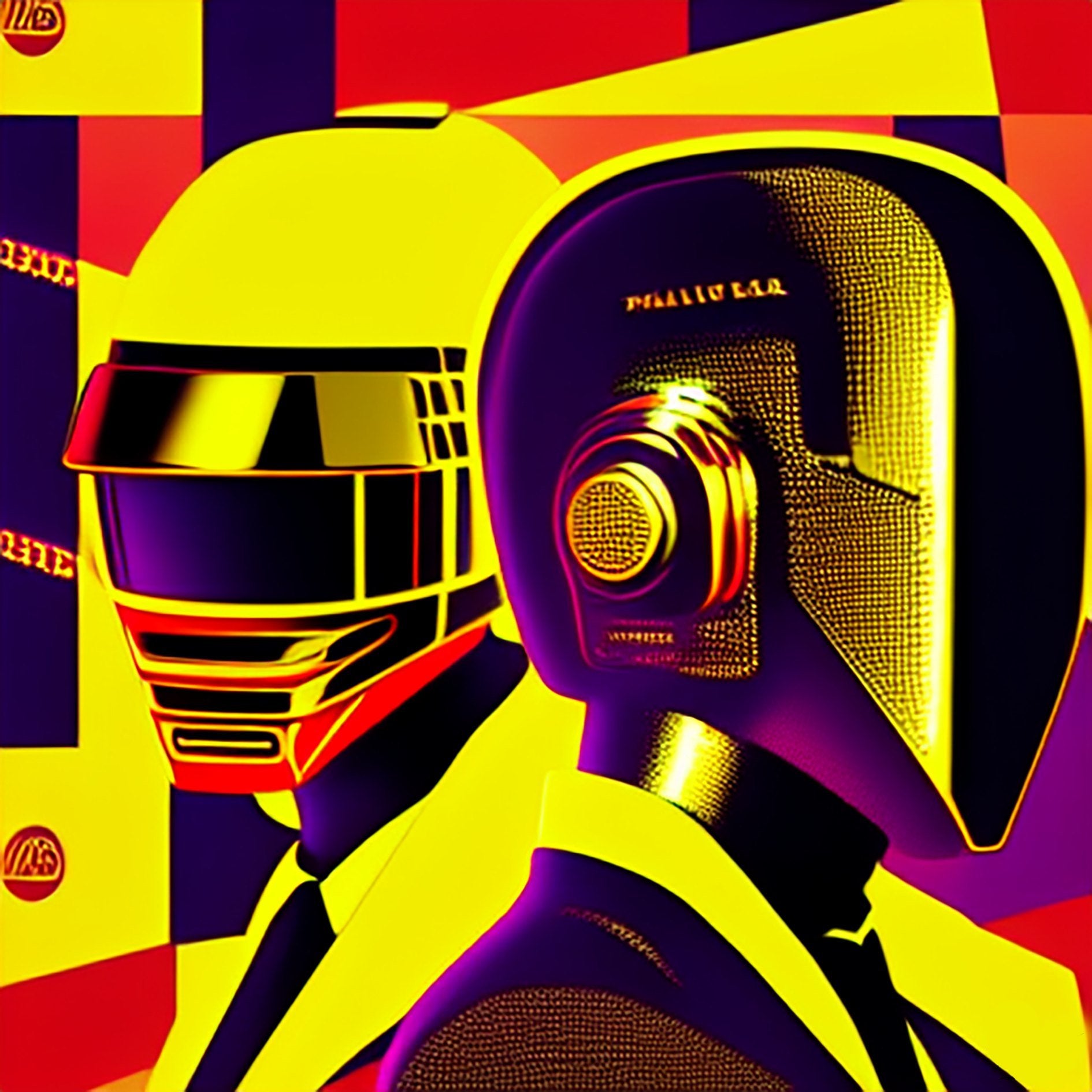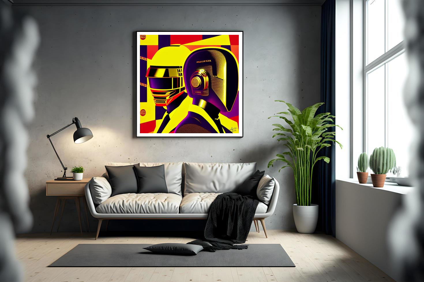 Binary Harmony is a bold, neo-futuristic portrait inspired by the legendary French electronic duo, Daft Punk. Rendered in a vivid palette of neon yellows, fiery reds, and electric purples, the image captures the iconic robot personas in a stylized pop-art aesthetic. The figures stand back-to-back in formal suits, symbolizing duality, mystery, and the fusion of man and machine.