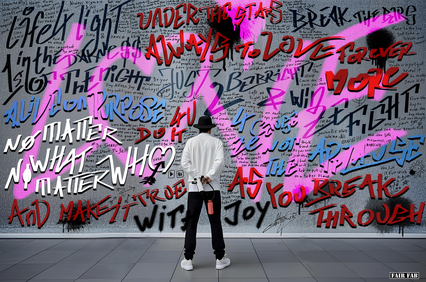 Artistic Description: Break Through is a powerful tribute to the raw expression and urgency of urban art. In this digital mural, a mysterious figure stands before a graffitied wall, caught mid-creation, spray can in hand. The wall is a chaotic yet poetic explosion of handwritten messages, slogans, and emotional declarations—phrases like “Hope,” “Under the Stars,” “No Matter Who,” “Break the Bars,” and “With Joy” layered in a variety of fonts, colors, and energies. At the heart of the piece, a massive pink “X” disrupts the grey backdrop—symbolizing both rebellion and transformation. The viewer witnesses a moment of quiet confrontation: the artist facing the wall, possibly himself, in a dialogue of resistance, love, and self-liberation. Artistic Influences: Street Art & Urban Calligraphy – Inspired by the emotional spontaneity of Jean-Michel Basquiat and the lettering style of RETNA and JonOne. Graffiti Culture – Echoes of the underground messages and personal statements found in 1980s New York and modern Berlin street walls. Conceptual Art – The use of written words as visual and emotional matter, reminiscent of Jenny Holzer and Barbara Kruger. Banksy-like Presence – The silhouette of the back-turned figure references anonymity in protest and art as silent revolution. Typography & Visual Poetry – The mixed calligraphy serves both as rhythm and rebellion, merging visual impact with textual resonance. Break Through is a declaration of intent and a manifesto for freedom—an ode to all those who write their truth on the wall, no matter what.