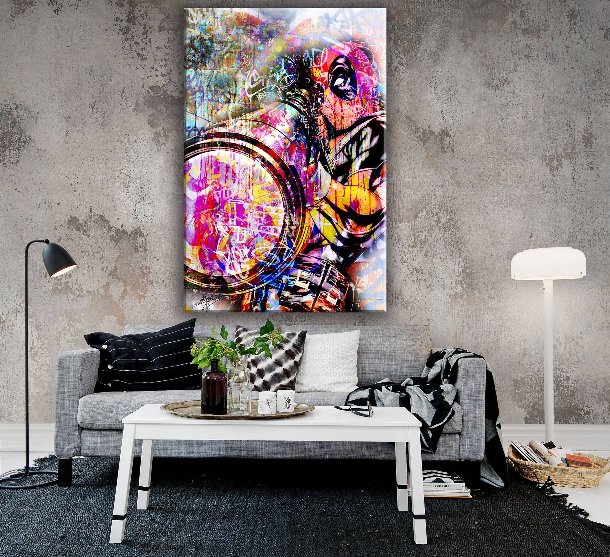 This riveting mural places a gas-masked figure at the heart of an urban chaos vortex—a surreal sentinel peering into the viewer through lenses that reflect kaleidoscopic distortion and emotional tension. The mask becomes both a symbol of protection and alienation, as swirling graffiti layers—blazing with pink, yellow, blue, and violet—suggest a society collapsing and regenerating in neon.