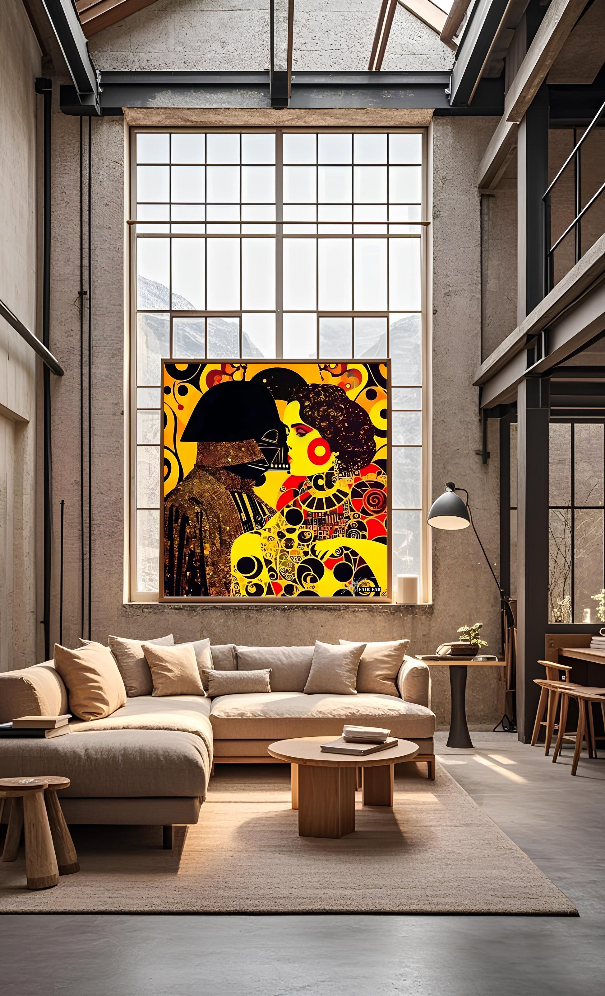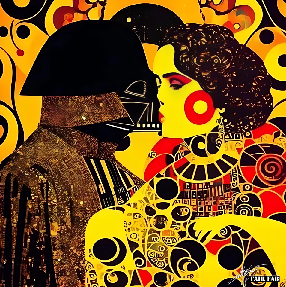 In Galactic Kiss, Fair Fab fuses the timeless romanticism of Gustav Klimt’s The Kiss with the pop-cultural iconography of Star Wars, creating a striking juxtaposition between tenderness and power, intimacy and mythology. With bold yellows, hypnotic spirals, and intricate patterns reminiscent of Art Nouveau, the piece invites viewers to question boundaries—between genres, between lovers, between darkness and light.