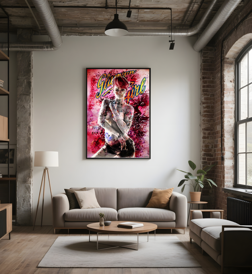 Glamour Girl – Rihanna Unfiltered is a provocative blend of vulnerability and power, rendered in hyper-saturated pinks and neon graffiti calligraphy. Rihanna stands topless, partially veiled by waves of scrawled script and urban motifs—an icon reclaimed and remixed, straddling the boundaries between celebrity, femininity, and rebellion.