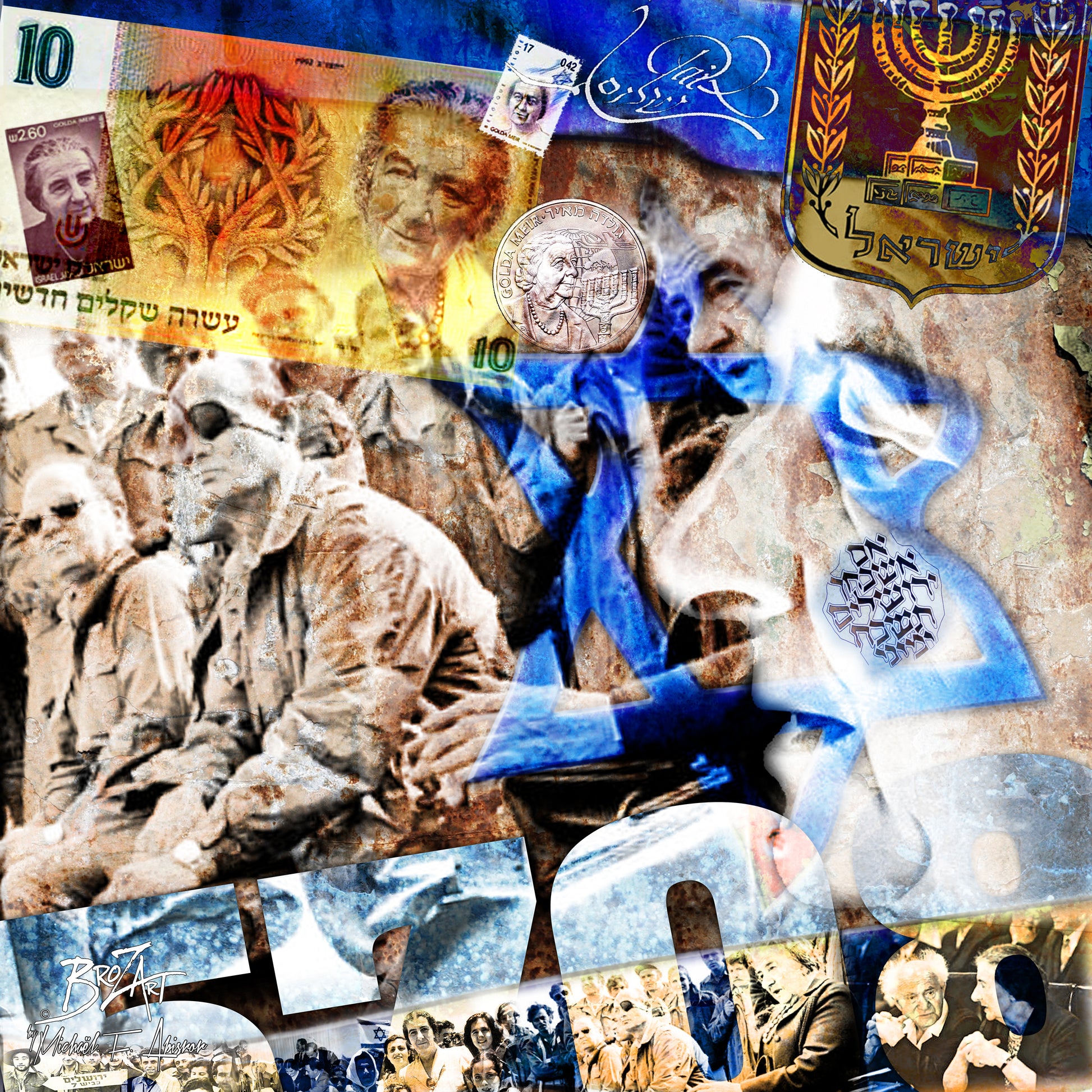 This collage-style mural pays tribute to two towering figures in Israeli history—Golda Meir and Moshe Dayan—through a layered composition of national symbolism, military imagery, and cultural memory. The artwork blends archival textures with graffiti aesthetics, creating a visual dialogue between leadership, resilience, and the cost of conflict.