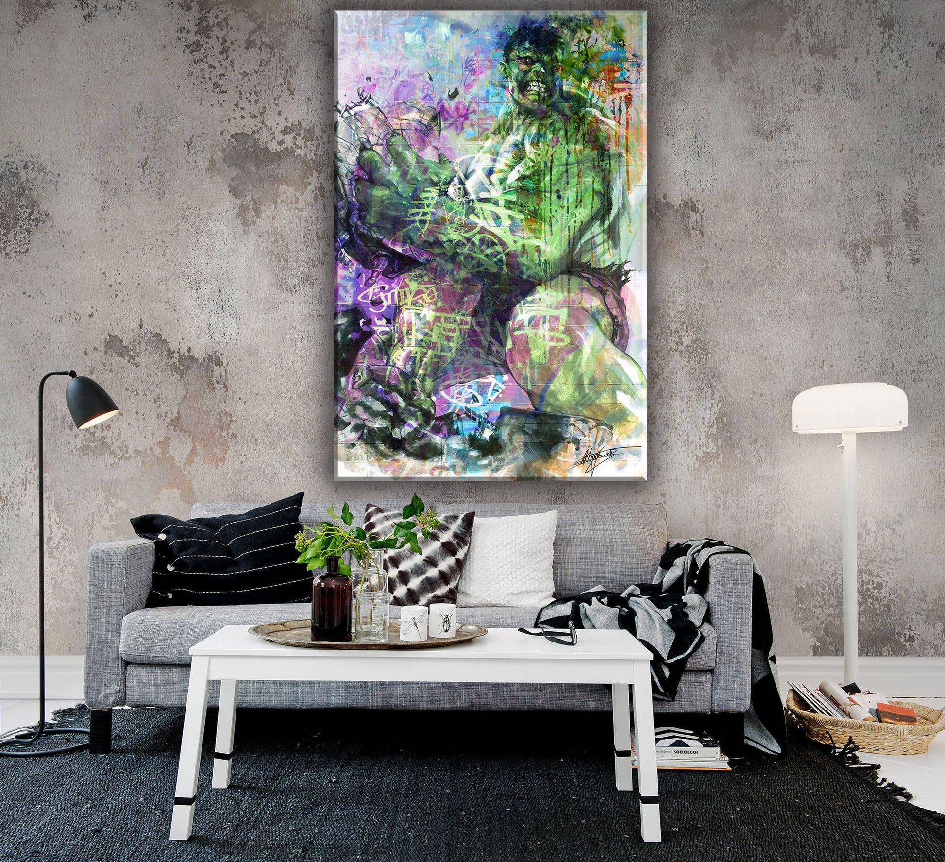 Hulk’s anatomy is exaggerated with wild color choices, creating both distortion and impact—as if raw power is leaking into nearby walls.
