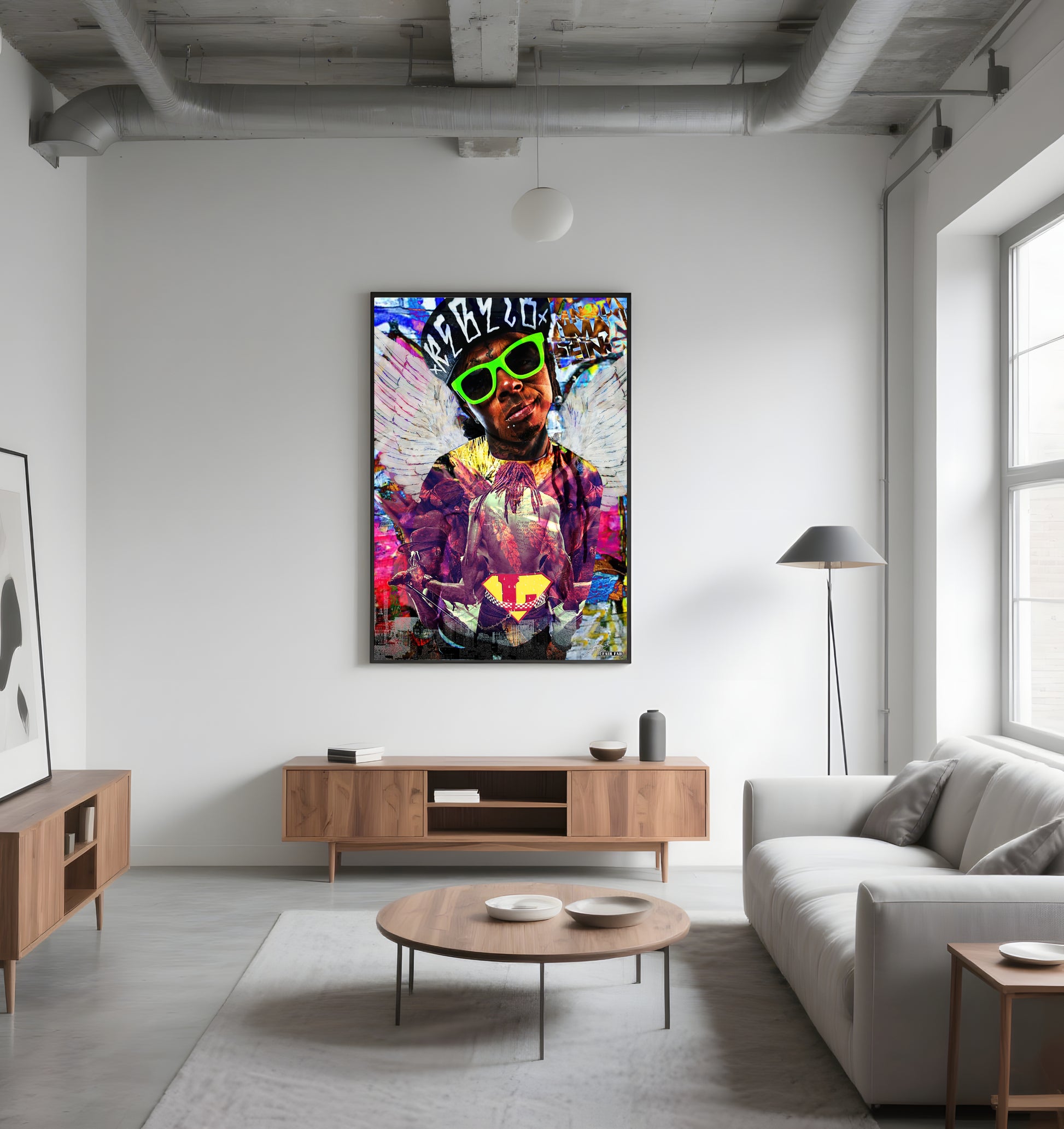 The composition is layered with graffiti, neon color bursts, and fragmented cityscapes — a chaotic yet celebratory homage to Lil Wayne’s surreal presence in the rap cosmos.