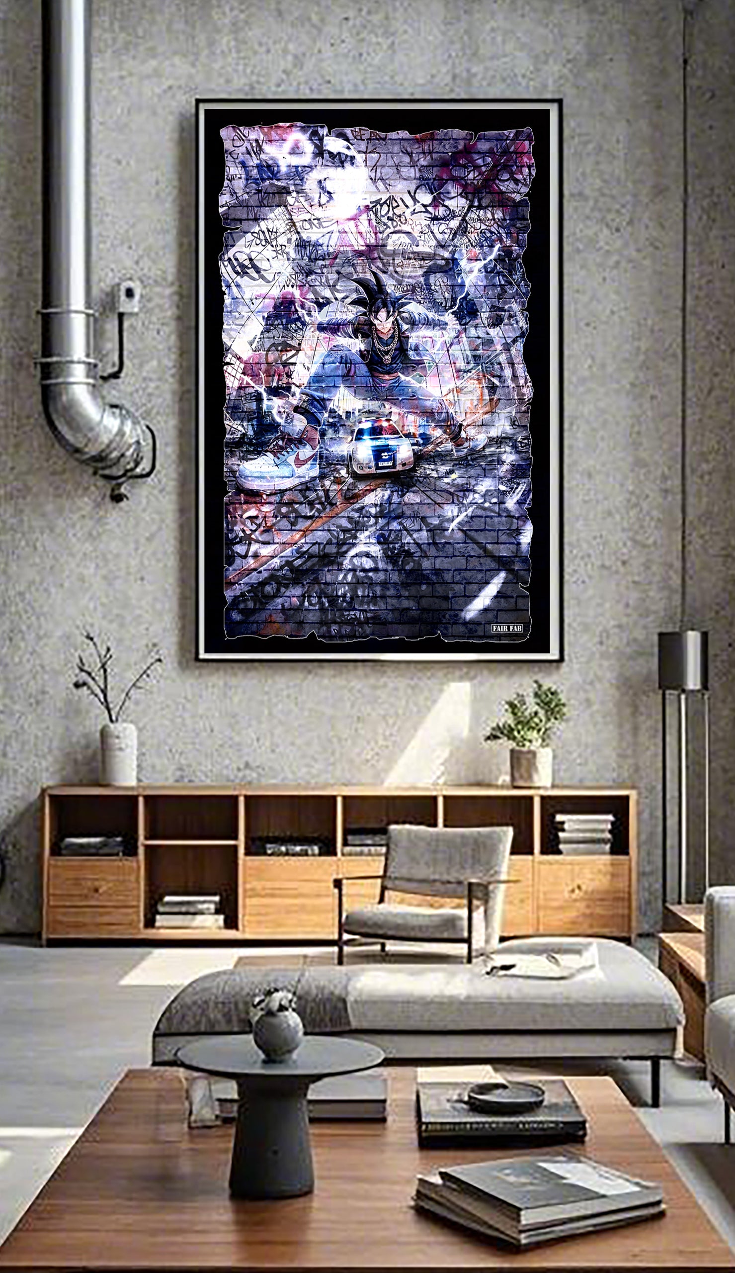 This urban-charged graffiti artwork unleashes a reinvented Goku—the Saiyan icon of Dragon Ball Z—as a contemporary rebel leaping from a neon-streaked reality. The character springs forward in sleek streetwear: black bomber jacket, ripped jeans, and crisp Nike sneakers. His wild, spiked hair flares upward like a burst of power, while a police car blares in the backdrop, catching the moment in cinematic tension.