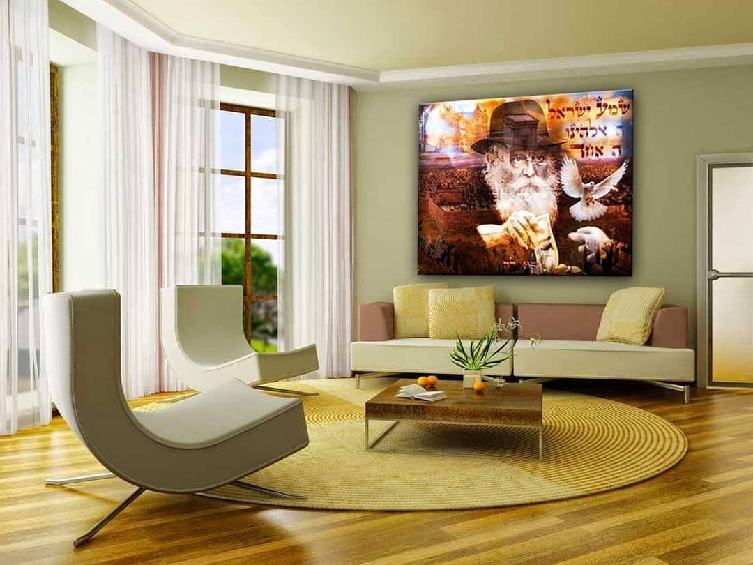 This digital collage is deeply symbolic and layered, intertwining Jewish messianic themes, historic imagery, and modern Chassidic spirituality. It centers around the prominent figure of Rabbi Menachem Mendel Schneerson, the Lubavitcher Rebbe, depicted in a semi-transparent, almost ethereal manner — signifying his spiritual presence beyond physical life. Key Visual Elements: The Rebbe (Lubavitcher Rebbe): His face dominates the composition, rendered with intensity and wisdom. His piercing eyes draw the viewer in, inviting introspection or spiritual awakening. 770 Eastern Parkway: Visible in the top left, this building is the Chabad-Lubavitch headquarters — a central icon in the movement, here glowing with divine light. The Third Temple: Superimposed near the Rebbe’s head, this represents the future rebuilding of the Holy Temple in Jerusalem — a core messianic hope in Judaism. Jerusalem & the Western Wall: The foreground shows ancient Jerusalem, filled with worshipers, shofar blowers, and figures in awe. The imagery evokes a return to Zion, as foretold in Jewish prophecy. Dove: A white dove in mid-flight dominates the right side, symbolizing peace, the Divine Presence (Shechinah), and the coming of redemption (Geoula). Hebrew Text: “שמע ישראל ה' אלוקינו ה' אחד” (“Shema Yisrael Adonai Eloheinu Adonai Echad”) — the fundamental Jewish declaration of monotheistic faith, layered with mystical typeface and colored script, hinting at divine unification. Gesture of Giving: The Rebbe appears to be giving a dollar — a reference to his custom of blessing people and giving them dollars for charity (tzedakah), representing his mission of spreading light through good deeds.