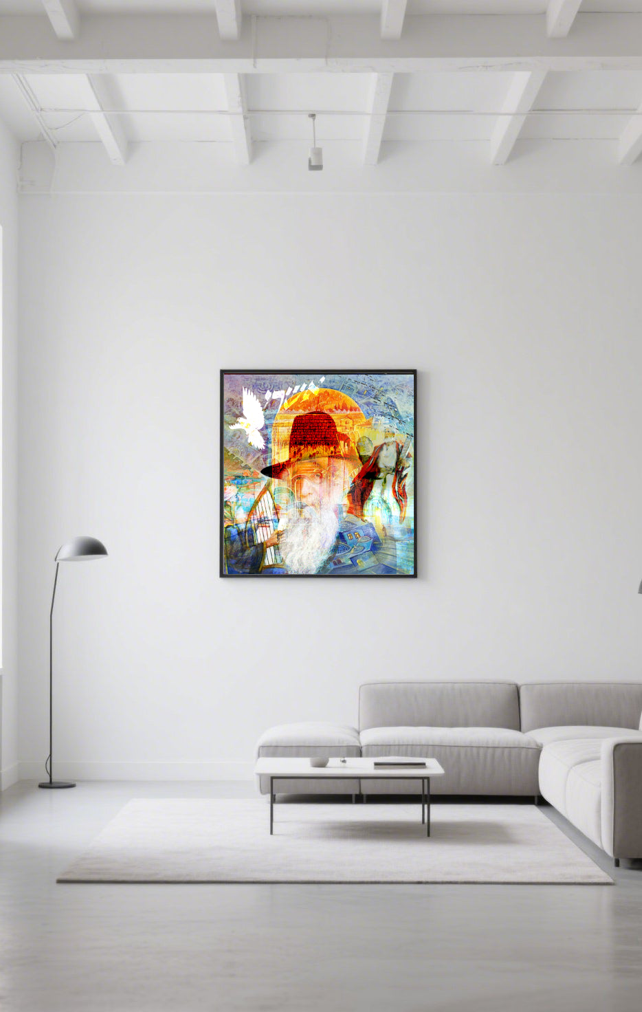 At the center, the Rabbi’s gentle, penetrating gaze emerges from beneath a wide-brimmed hat — symbol of humility and tradition. His long white beard, a river of purity and wisdom, flows through a surreal landscape blending time and eternity. His presence anchors the viewer between Jerusalem’s golden stones and celestial realms.