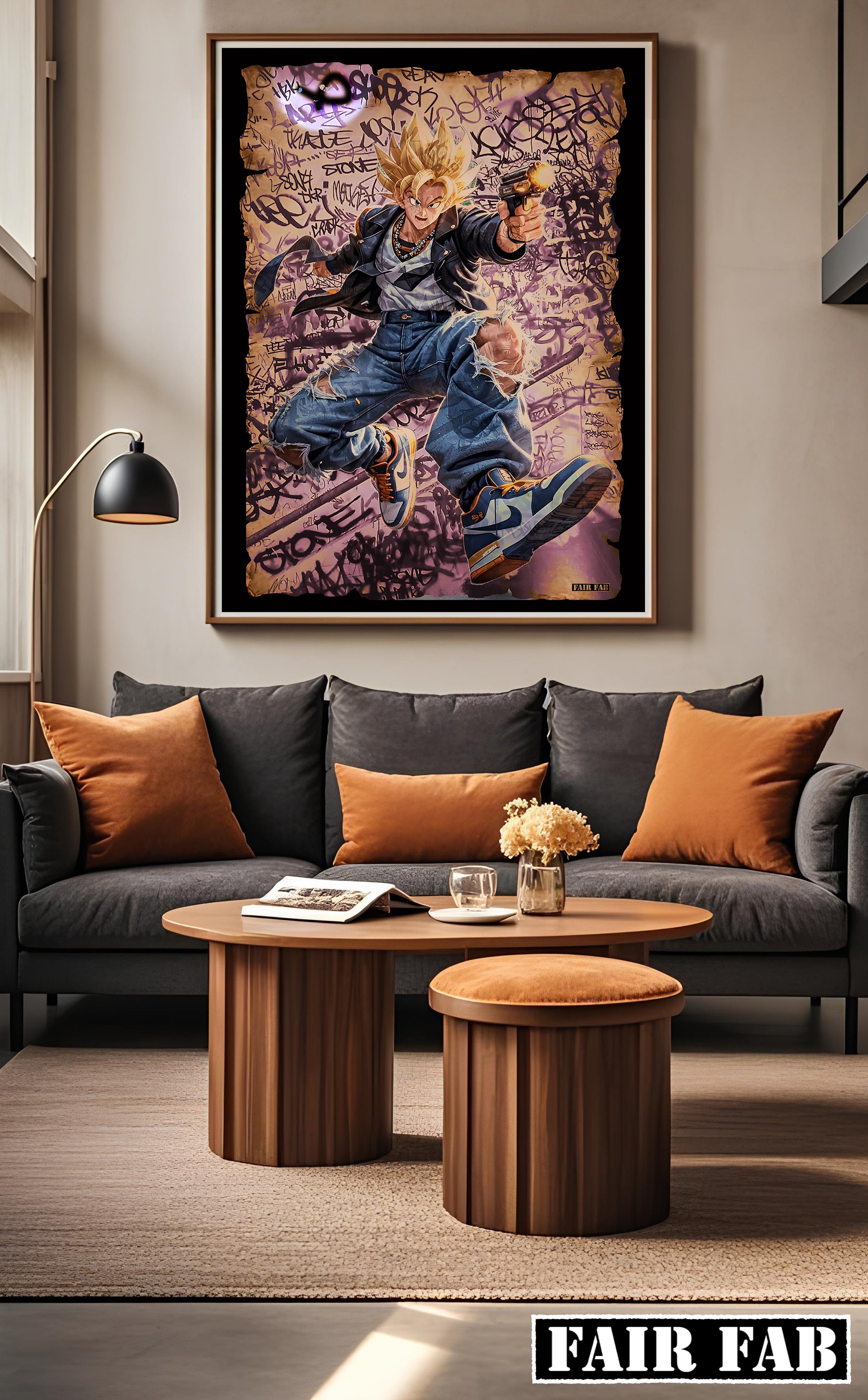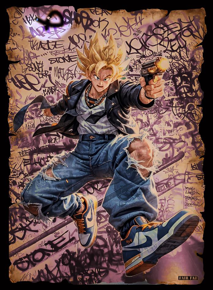 This is a bold, street-art inspired reimagining of Trunks from Dragon Ball Z.