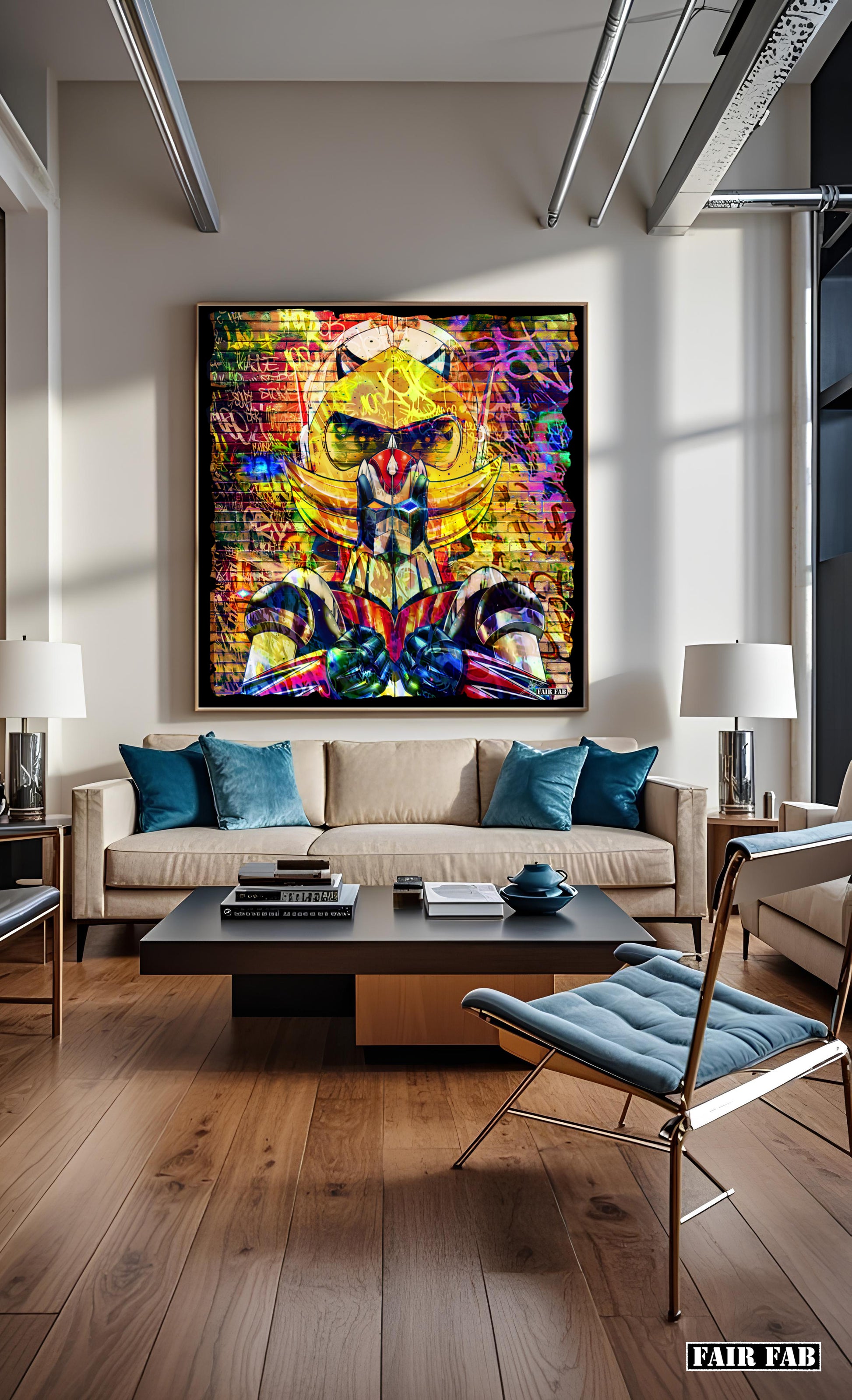 Title: Urban Goldorak – Rise of the Mecha IconArt Description: This electrifying artwork reimagines Goldorak (Grendizer), the legendary mecha hero from Japanese anime, through the explosive lens of urban graffiti and neo-pop expressionism. Bold, vivid strokes in neon yellows, reds, purples, and blues ignite the composition, with the robotic warrior emerging powerfully from a chaotic, spray-painted brick wall.Goldorak’s pose—arms crossed, eyes blazing—projects both strength and defiance, anchoring him as a symbol of resilience in a fractured world. The background is a frenzied collage of graffiti tags, urban textures, and calligraphic scribbles, recalling the anarchic energy of New York subway art from the 1980s and the visceral textures of contemporary street artists like RETNA, Crash, or Mr. Brainwash. The artwork speaks to a fusion of cultures—Japanese anime mythology meets Western street art rebellion—creating a dialogue between tradition and reinvention, past and present. The contrast between the rough brick texture and the polished, metallic mecha armor evokes a feeling of tension and transformation, like a hero emerging from the chaos of modernity.Now framed in a sleek, modern interior, this piece becomes a cultural artifact, a bold centerpiece that merges childhood nostalgia with the pulse of contemporary visual culture.Signed “FAIR FAB,” this composition elevates a childhood icon to the realm of fine urban art.