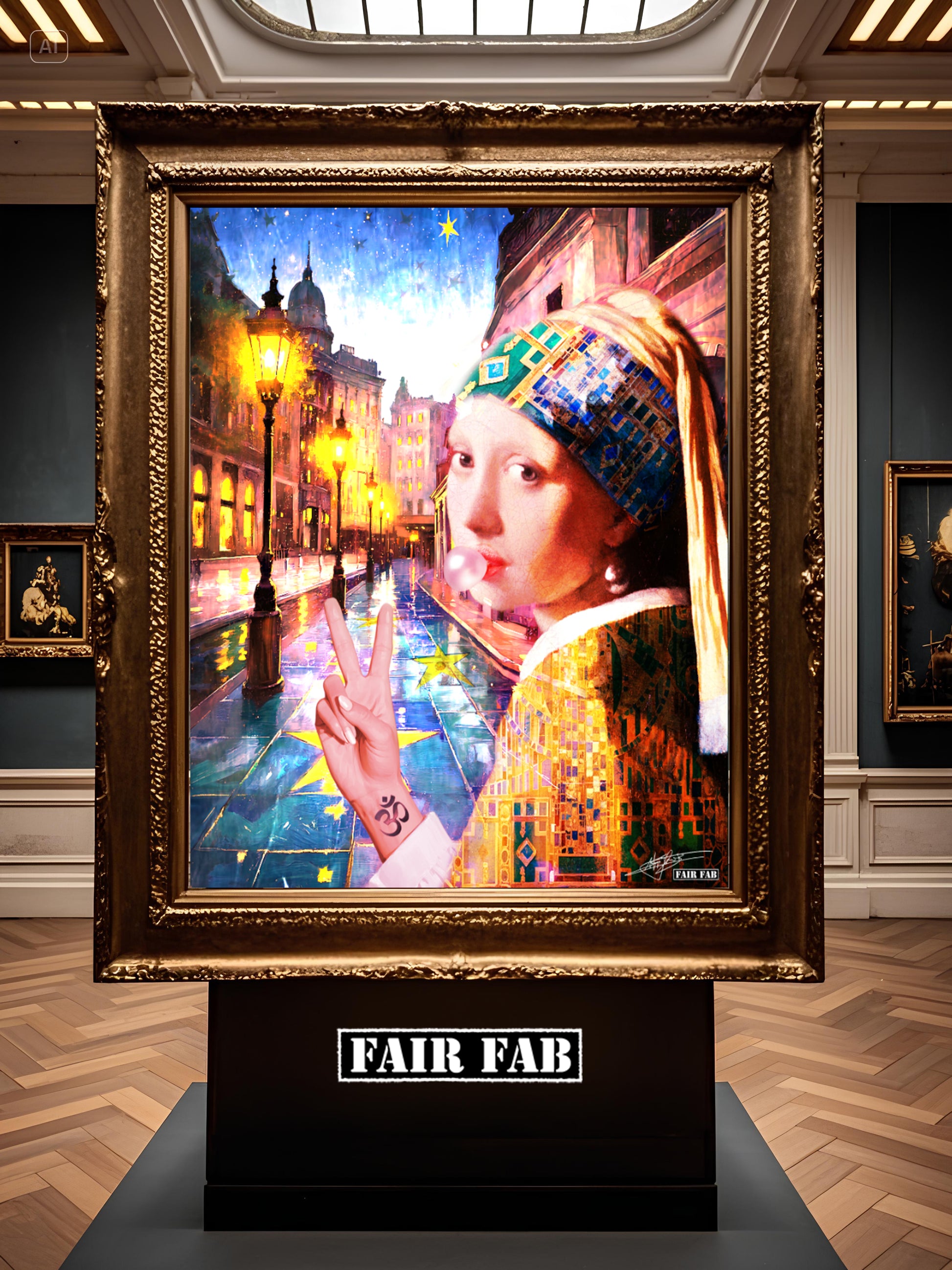 “Classic elegance collides with modern rebellion in this dazzling reimagining of Vermeer’s Girl with a Pearl Earring. Bathed in urban neon glow, the timeless muse steps boldly into the 21st century — blowing bubblegum, flashing a peace sign, and radiating pure pop-art charm.”