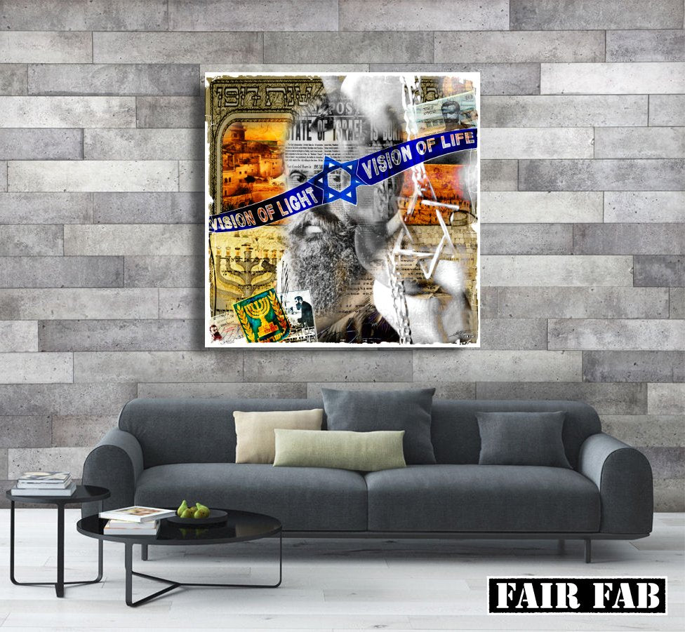 This mixed-media collage blends historical references, Zionist iconography, and symbolic visual layers to create a contemporary tribute to Jewish identity, perseverance, and statehood. At the heart of the piece appears the faint but recognizable face of Theodor Herzl, founder of modern political Zionism, overlapped with cultural and political symbols of Israel. Key Elements: Central Portrait: A grayscale portrait of Herzl is subtly embedded in the center, representing vision and leadership. His face is contemplative and blends into the textures of text and imagery around him — symbolizing how his legacy is interwoven with the very fabric of modern Israel. Blue Star of David & Banner: Cutting diagonally across the composition is a vivid Star of David, combined with the words "VISION OF LIGHT" and "VISION OF LIFE". These phrases suggest spiritual clarity and hope, echoing Herzl's famous quote: “If you will it, it is no dream.” Historic References: State of Israel declaration newspaper headlines, coins, maps, and the year "1948" are layered across the canvas — referencing the establishment of the state. Menorah: The golden seven-branched candelabrum appears more than once, symbolizing Jewish continuity and divine light. Hebrew script and Judaic symbols further reinforce the religious and cultural identity. Collage Aesthetic: Torn paper textures, distressed backgrounds, and mixed fonts evoke the feeling of a cultural mosaic — both raw and refined — representing the multifaceted identity of Jewish people and the State of Israel. 🎨 Artistic Influences & Interpretations Zionist Modernism: The piece is a tribute to Zionist ideology, rooted in Herzl’s vision of a Jewish homeland. It captures both the idealism and the struggle behind the creation of Israel. Contemporary Pop-Political Art: Similar in tone to Shepard Fairey or Peter Tunney, this work draws on urban collage and political poster art, turning history into visual activism. Symbolic Duality: The contrast of black-and-white versus bright blue and gold highlights the duality of past vs future, suffering vs light, and memory vs vision. The message is both commemorative and aspirational: it honors a legacy while envisioning a bright spiritual and national destiny. Text as Power: The bold phrases "VISION OF LIGHT" and "VISION OF LIFE" elevate the message into a universal human hope, while still grounded in Jewish narrative.