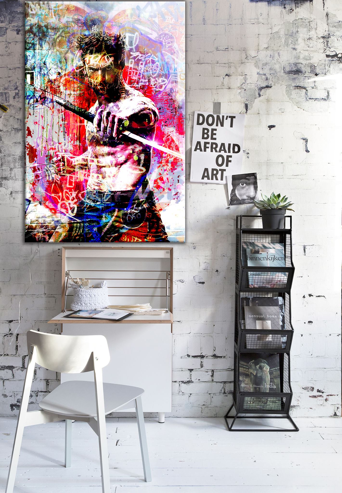 The background seethes with graffiti tags, chaotic brushwork, and explosive color—a storm of red, green, black, and metallic silver.