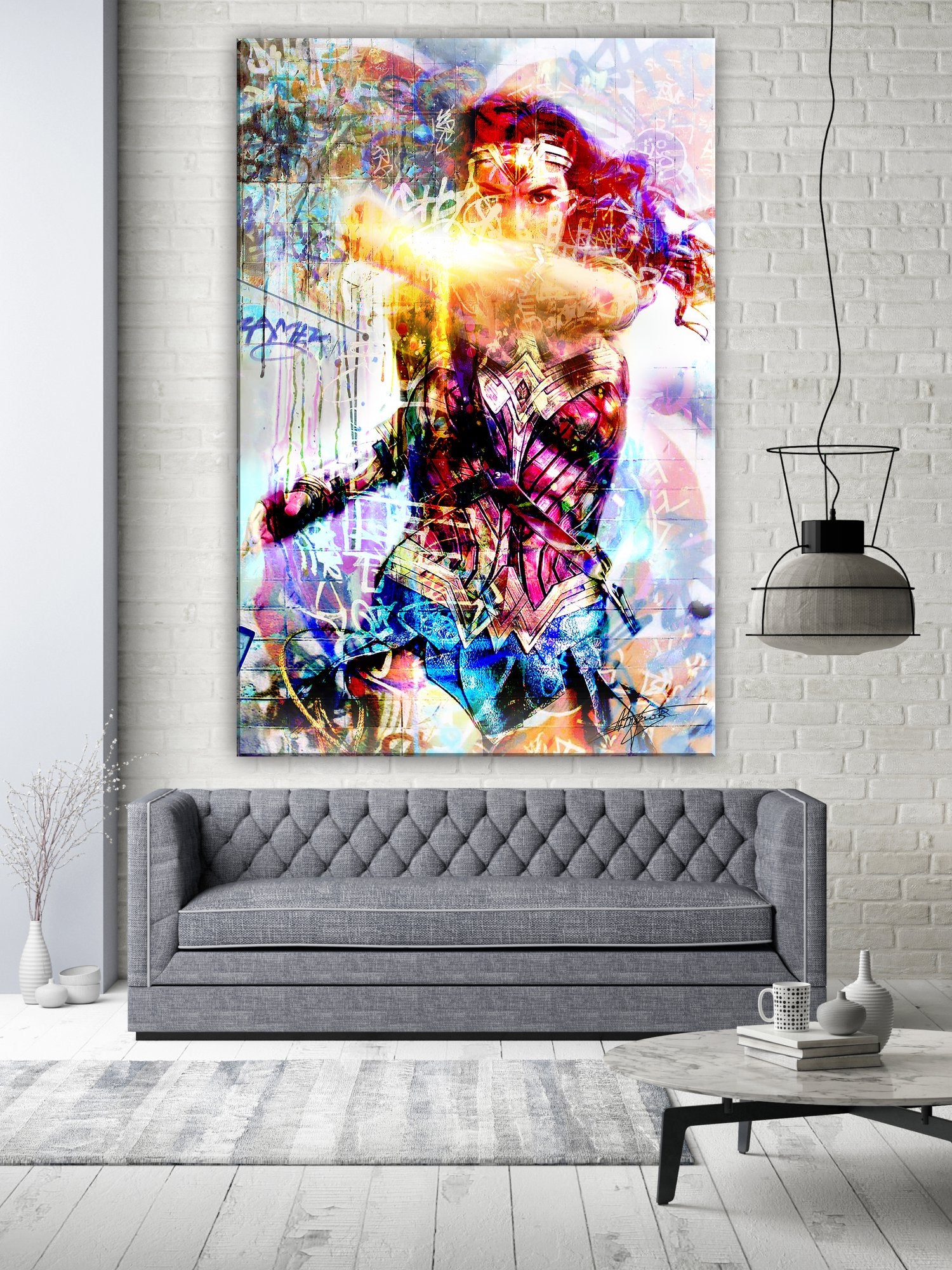 This graffiti mural offers a bold, streetwise reinterpretation of Wonder Woman, blending mythic strength with urban rebellion. Centered in dynamic motion, she raises a gleaming arm to deflect incoming force—her iconic bracelet glowing like a burst of divine power. Her armor shimmers with gold accents, but it’s the wild, graffiti-drenched backdrop that transforms this superhero into a symbol of modern defiance.